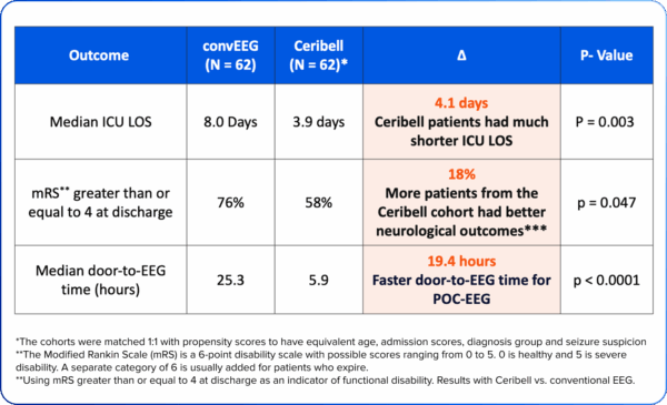 Shorter ICU length of stays and improved patient outcomes with Ceribell compared to conventional EEG only13