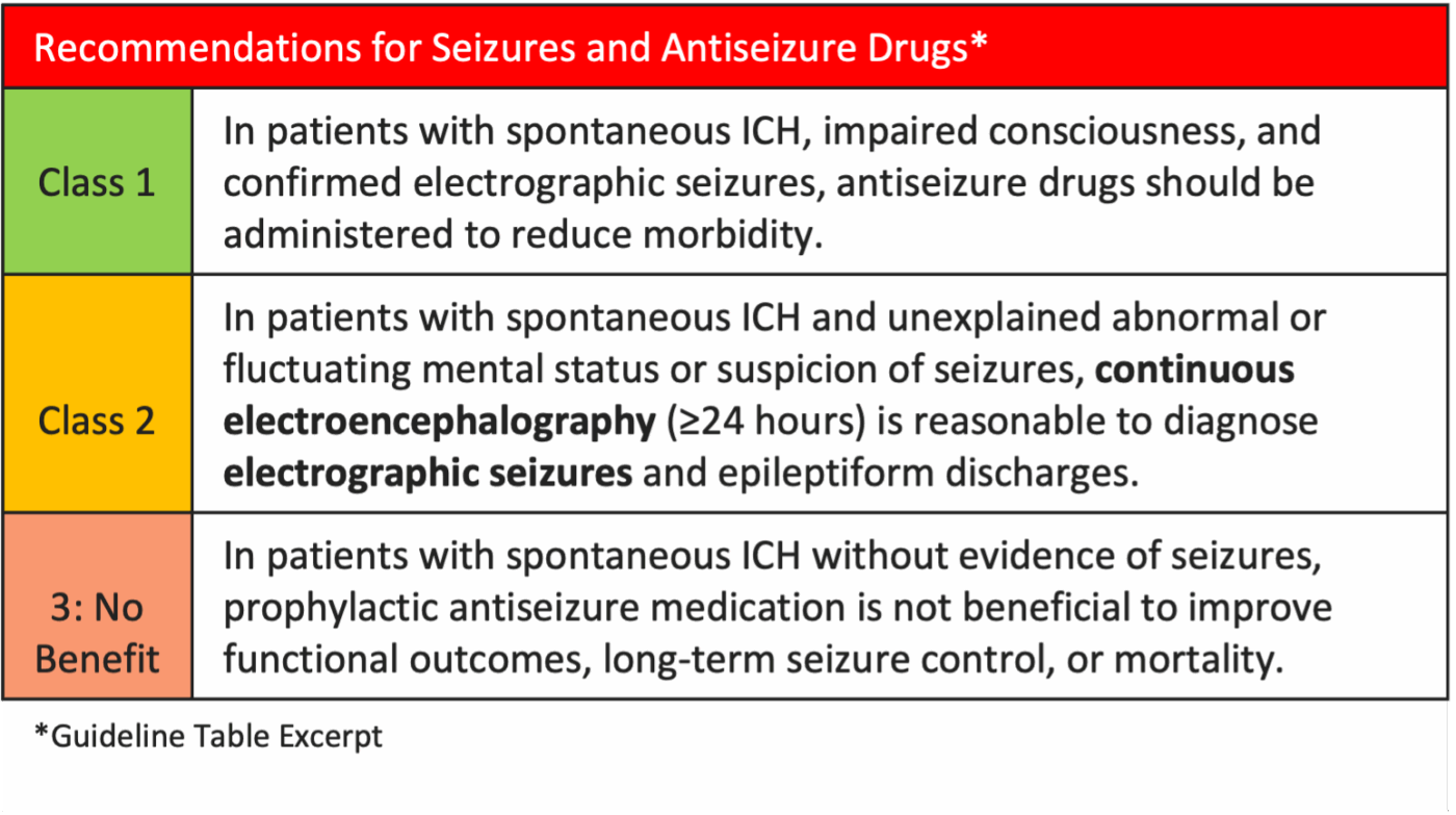 “New-onset seizures in the context of spontaneous ICH are relatively common […] and most of these seizures occur within the first 24 hours of the hemorrhage.”