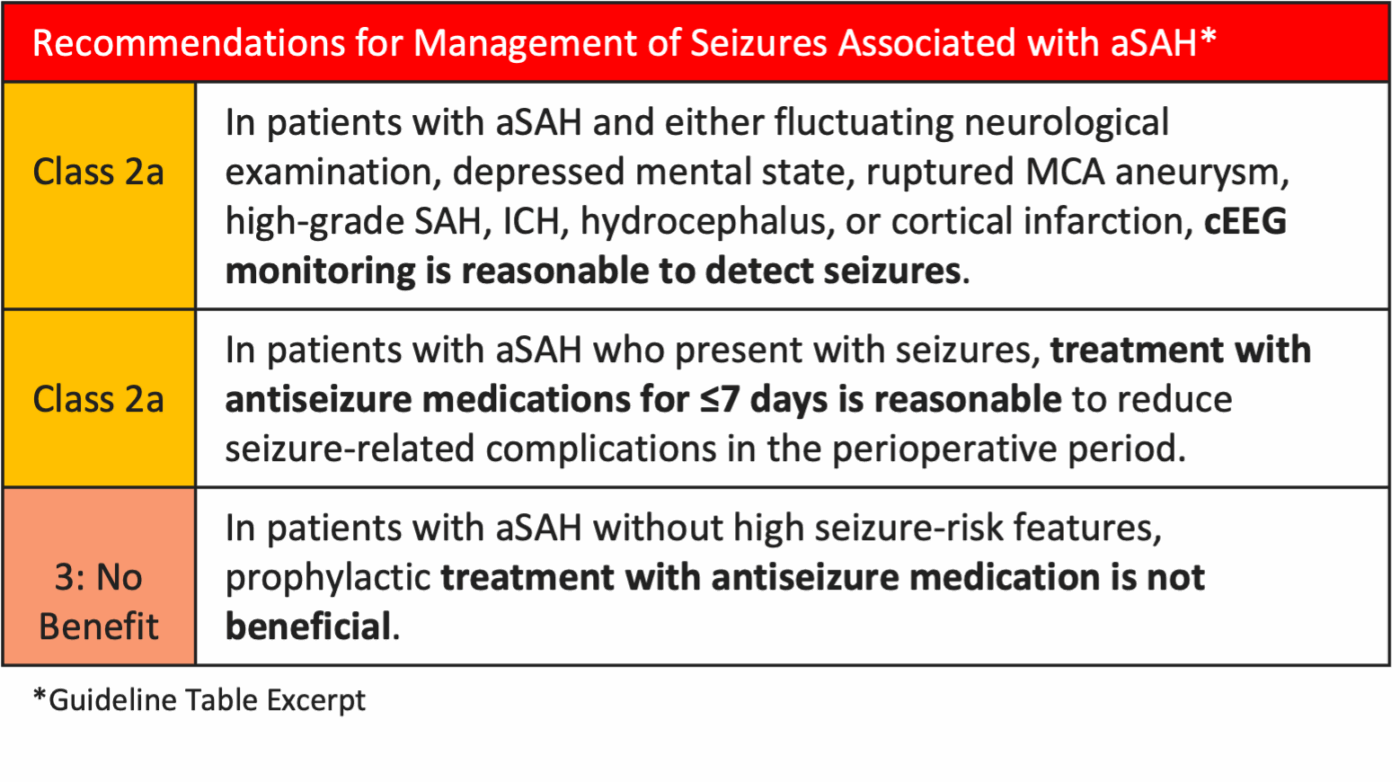 “Monitoring with continuous EEG can detect nonconvulsive seizures, especially in subarachnoid hemorrhage patients with depressed consciousness or fluctuating neurological examination.”