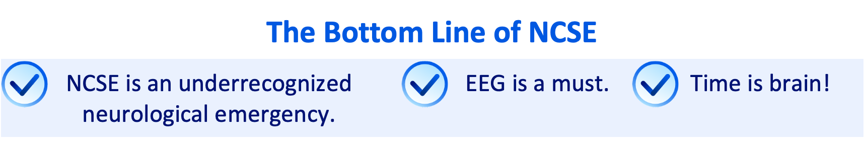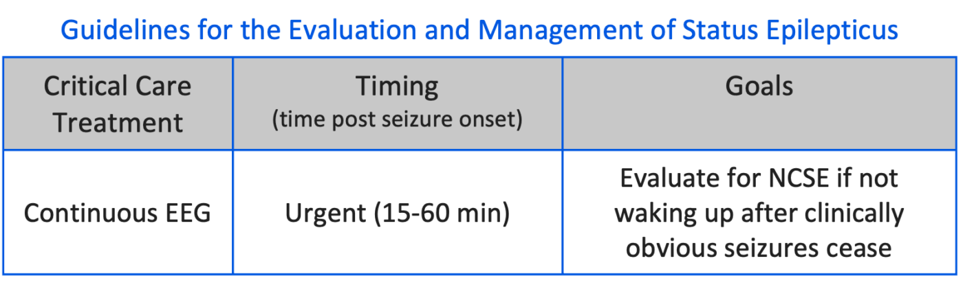 “EEG should be initiated within 15-60 minutes to evaluate for NCSE if [patient is] not waking up after clinically obvious seizures cease.”
