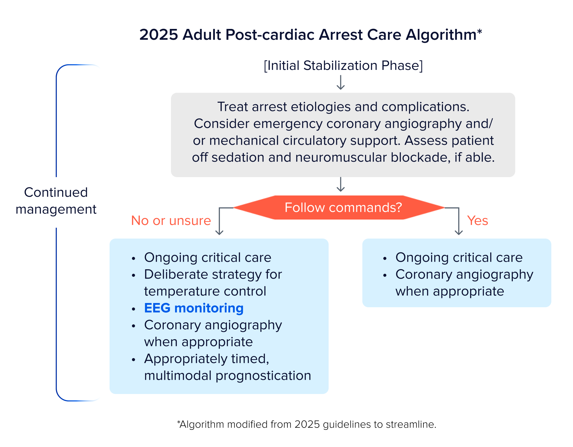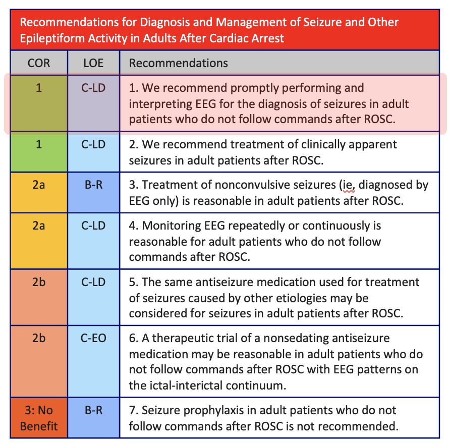“Recommend promptly performing and interpreting EEG for the diagnosis of seizures in adult patients who do not follow commands after ROSC.”