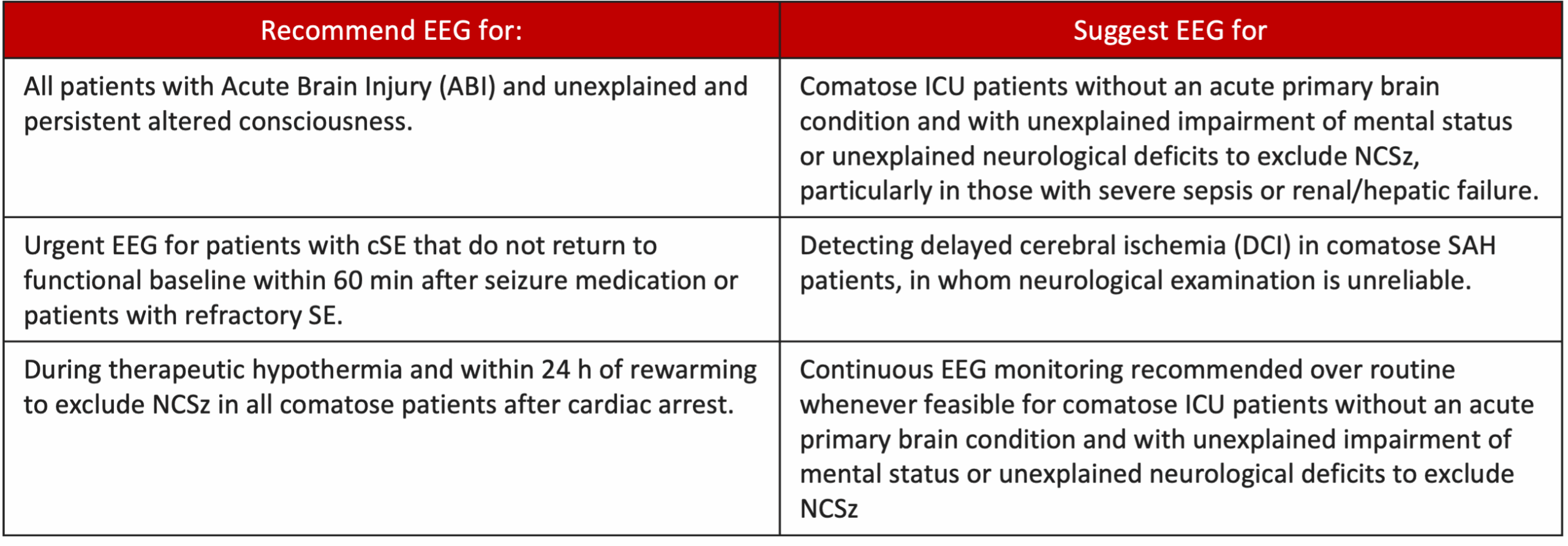 “We recommend EEG in all patients with ABI [Acute Brain Injury] and unexplained and persistent altered consciousness […and] in patients with cSE that do not return to functional baseline within 60 minutes after seizure medication.”